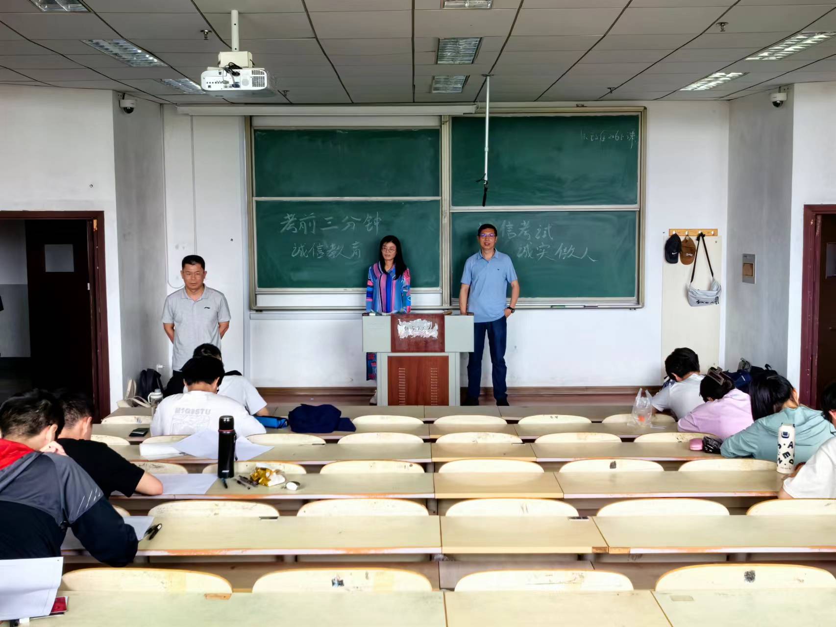 6月12日、17日,李卉、巩敦卫等带领学院教学督导员、辅导员深入考场巡视,检查“学生党员诚信考试桌牌”挂牌情况。监考教师、辅导员开展“考前三分钟”考风考纪教育,把相关考试纪律规定、作弊受处分案例进行讲解,教育引导学生自觉遵守纪律,增强诚信意识,营造公平环境,打造诚信学院。