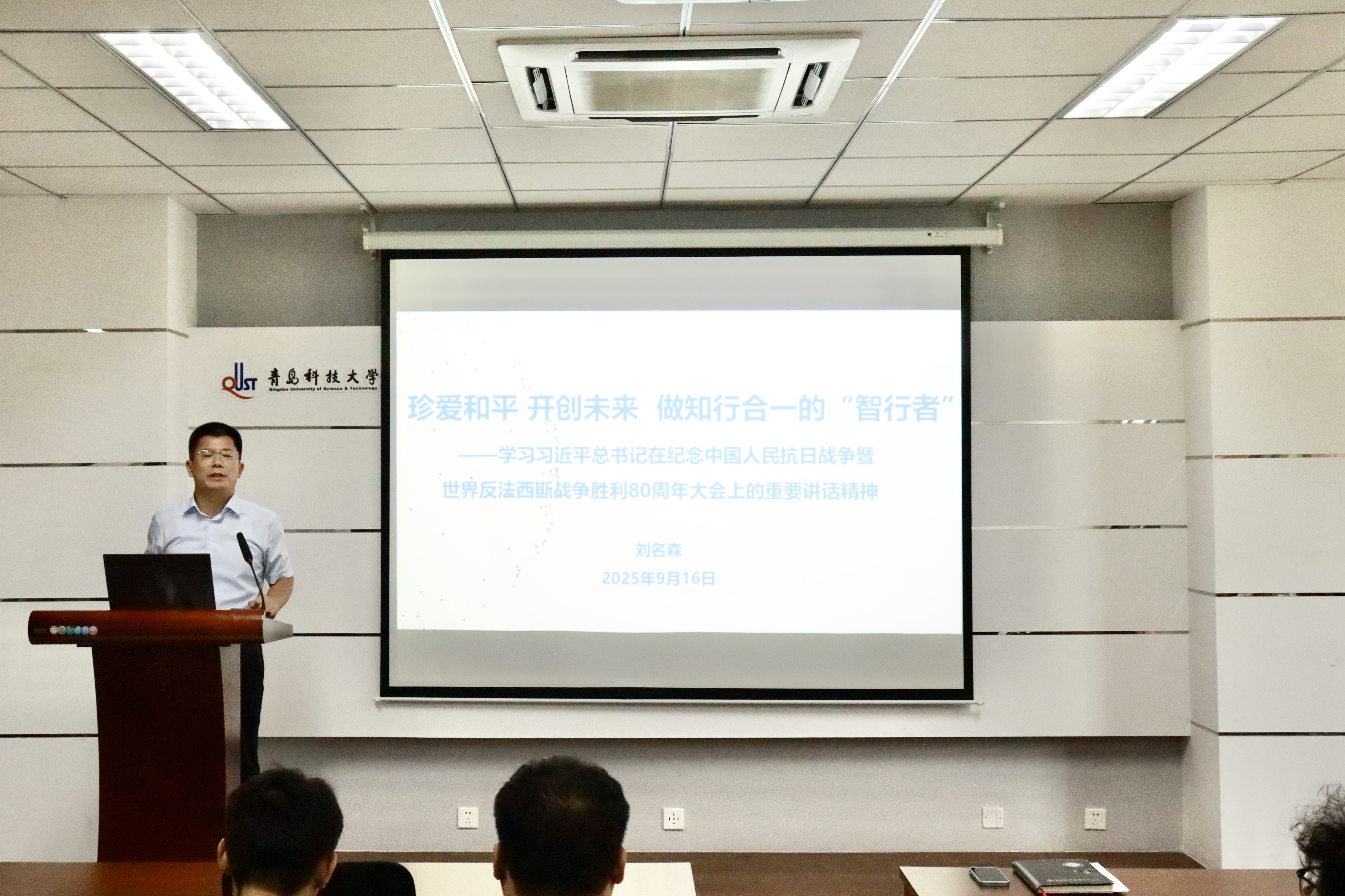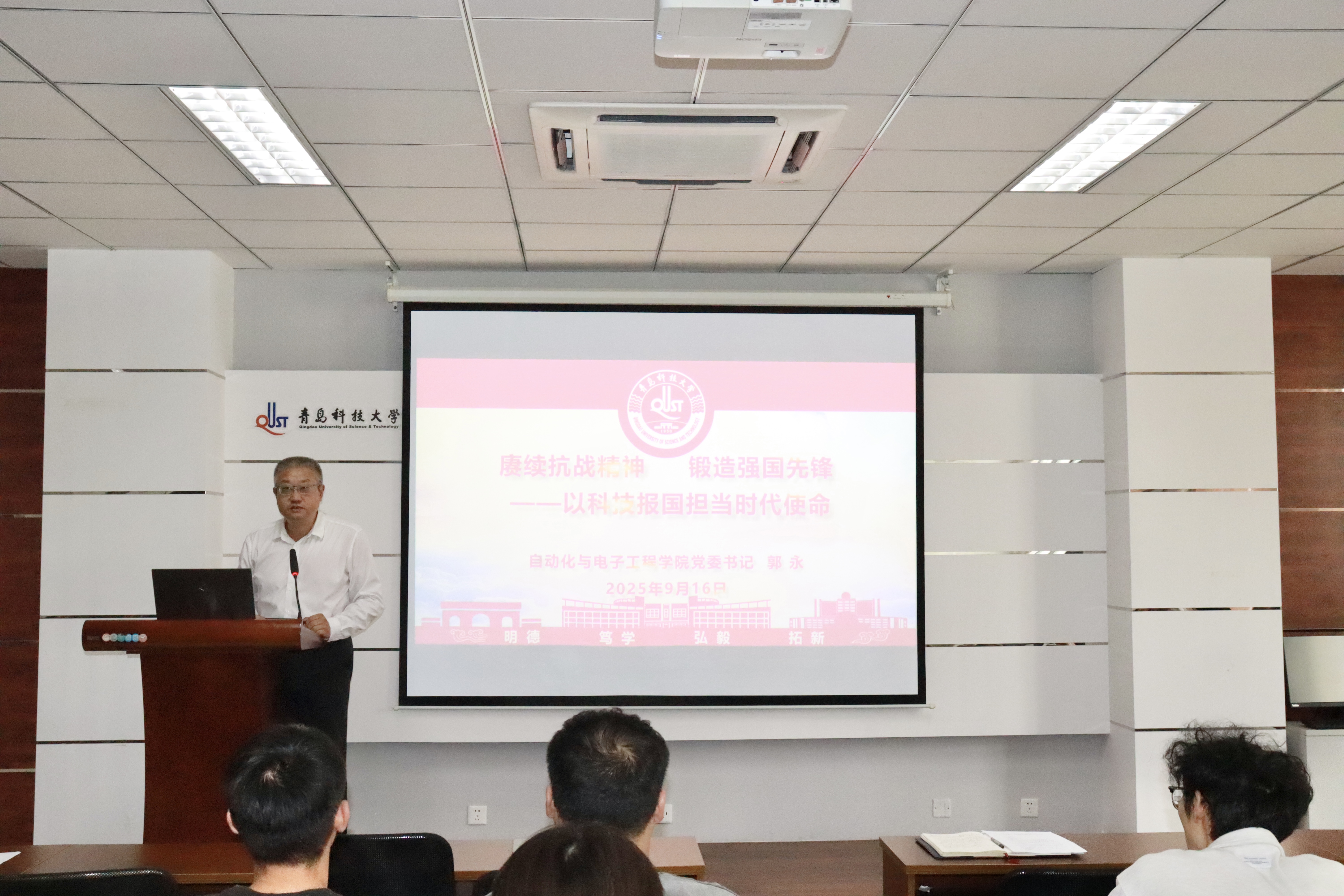 在集中观看习近平总书记在纪念中国人民抗日战争暨世界反法西斯战争胜利80周年大会上的重要讲话视频之后,郭永做题为《赓续抗战精神,锻造强国先锋——以科技报国担当时代使命》讲话,他围绕三个关键词“铭记、传承、担当”对全体学生党员提出三点期望:一是铭记历史,守护和平与真理,坚决捍卫抗战胜利成果,认识到中国在世界反法西斯战争中所做出的巨大历史贡献,警惕历史虚无主义;二是传承抗战精神,将抗战精神转化为科研动力,以“明知山有虎偏向虎山行”的勇气,攻克核心技术卡脖子难题,积极参与“挑战杯”、“互联网+”等创新创业赛事,将论文写在祖国大地上;三是勇于担当使命,做“顶天立地”的科研者,做“知行合一”的实干家,从身边小事做起,在研究生室安全卫生、宿舍建设中发挥先锋模范作用,严格落实学院党委、团委、辅导员老师提出的工作任务和要求,带动身边同学共同进步,让“一名党员,一面旗帜”在校园里高高飘扬!
