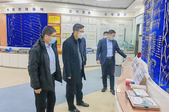 在新华手术器械有限公司,公司党支部书记、副总经理王正发,自动化06届校友、公司副总经理马涛陪同调研了公司的发展情况。马寒代表学院向校友在疫情期间对学校的捐助表示感谢,马涛表达了对学校的关注和感谢,希望能够多维度与学校开展合作。