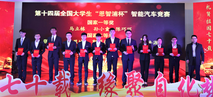 副校长吕万翔等嘉宾分别为2019年全国大学生“恩智浦杯”智能汽车竞赛、“西门子杯”中国智能制造挑战赛、“TI杯”全国大学生电子设计竞赛以及学院第五届“艾克特”杯“十大优秀学生”、第一届“艾克特”杯“最美宿舍”获奖同学颁奖。