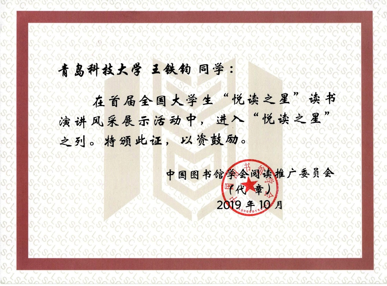 学生王铁钧(演讲参赛作品:镇定思痛,吾辈自强)和传媒学院何宜莲,经过层层选拔,荣获全国大学生“悦读之星”,校图书馆被评为星级组织单位,图书馆流通部主任徐艳红获评“星级指导教师”。