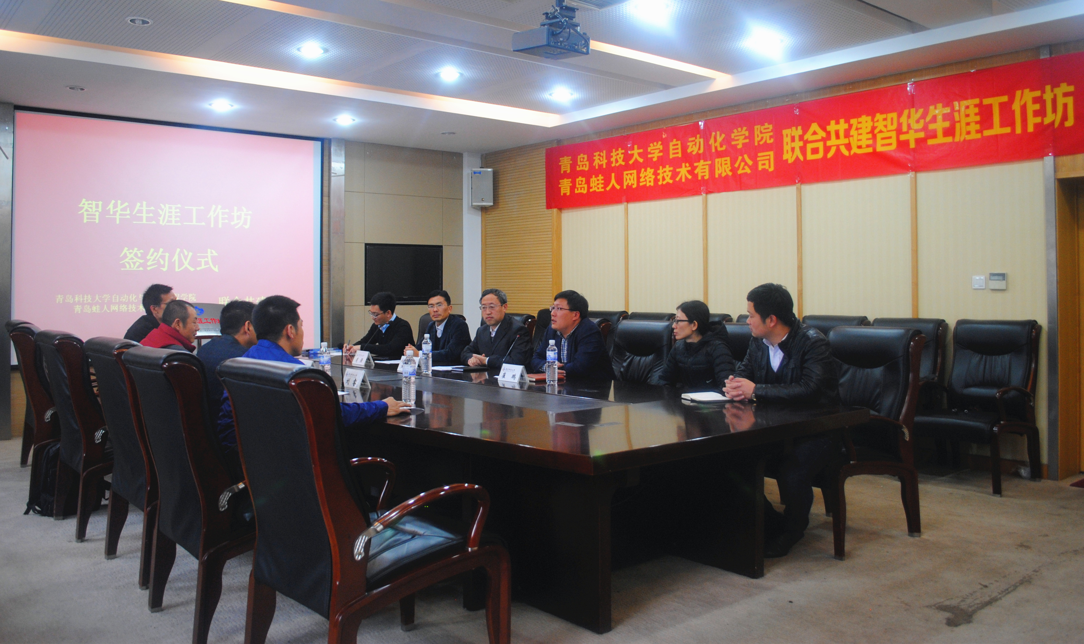 与青岛蛙人网络技术有限公司共建的山东省首家校企合作大学生职业生涯工作坊——“智华生涯工作坊”揭牌仪式在四方校区第一会议室举行。大象传媒