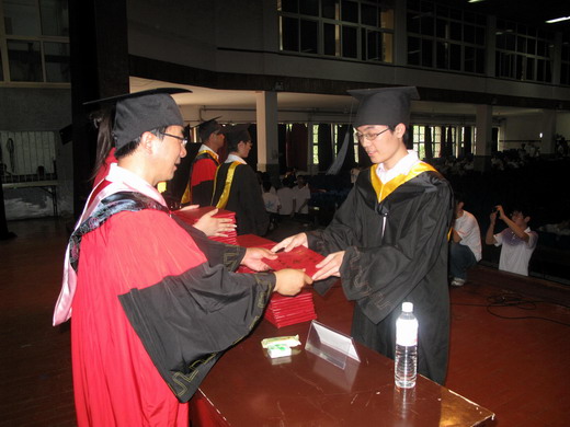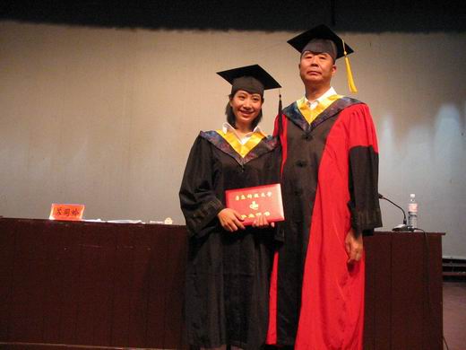 伴随着欢快的音乐和热烈的掌声,学院党总支书记兼院长王培山给毕业生代表颁发毕业证书和学位证书,学校副书记苏同岭亲手为身着学士学位服的学生代表一一扶正学位帽,拨转流苏,并与他们握手和合影留念。