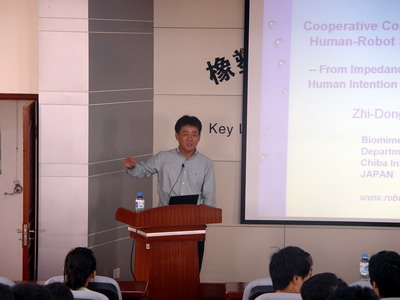 王培山发表了热情洋溢的讲话,他对张宏教授、王志东教授的来访表示诚挚的欢迎和衷心的感谢;在学院学科建设的关键时期,两位专家学者的学术报告对于促进自动化控制领域的人才培养和学科建设必将起到积极作用。两位教授分别以《挖掘监测操作中的图像处理技术问题》、《多机器人和人机系统的协同控制—由基于协作的阻抗到人类意图理解》为题,深入浅出地介绍了自动化领域学术前沿的研究方法和研究成果,为在座师生做了精彩的学术报告,赢得了经久不息的掌声。