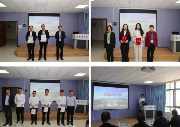 合作发展处处长张青山为海信集团模具公司总经理鲁韶磊和海信冰箱营销公司副总经理薄元勋颁发了捐赠证书。海信集团研发与供应链管理部副总经理刘玉秀、党委学生工作部副部长王丽分别为我校兼职辅导员朱雅倩、海信集团模具公司招聘经理宋德鹏颁发班主任聘书。海信集团青岛模具工厂副总经理胡富强、校友办副主任汪洋为海信班首期成员颁发礼品。学生代表机电工程学院20级研究生聂万富发言。