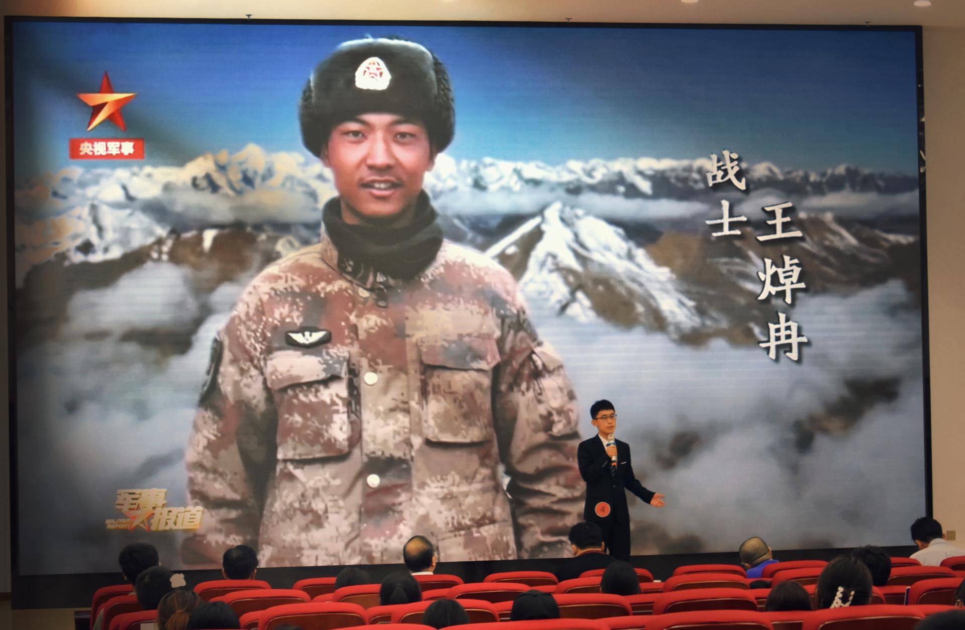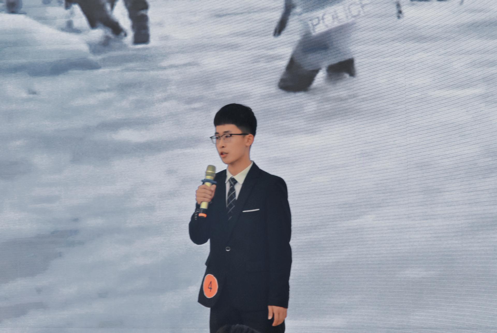 学生阚新磊以“国防重任,在于你我”为主题,通过讲述去年6月份外军越线挑衅事件中肖思远烈士在危难之际挺身而出的故事,呼吁广大青年学生学习卫国戍边英雄钢铁般的意志和磐石般的信仰作为,努力成为民族栋梁,面对再多的敌人也要敢于张开双臂,共同保卫祖国的大好河山!