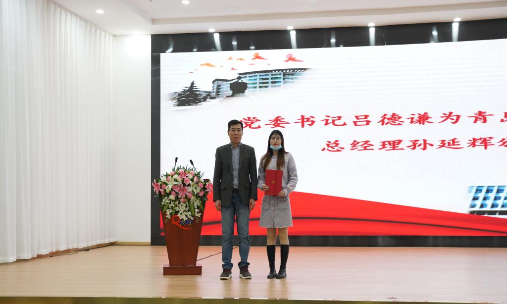 会上,党委书记吕德谦为青岛展诚科技有限公司总经理孙延辉颁发捐赠证书。