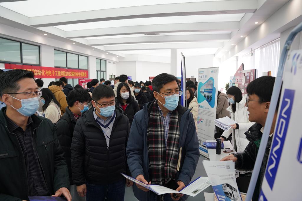 随后,学院“AI工赋”首场招聘会在报告厅门口火热展开。此次招聘会在疫情防控要求下,共组织16家优质用人单位参与,涵盖专业相关的多个就业岗位。前来招聘的单位都精心准备了印有企业logo的小礼品、笔记本、手办,到场同学提前对应聘岗位进行了解,精心准备简历,现场主动把握机会,积极投递。