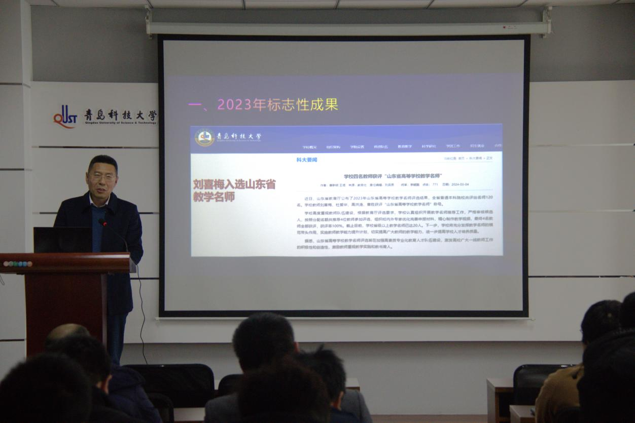 学院常务副院长兼机器人学院常务副院长巩敦卫以《埋头苦干抓落实迎难而上开新局》为题,以“成果多、差距大、任务重、真抓实干”四个关键词为线索全面梳理总结了学院2023年工作成效及新年度重点工作任务。他提到,2023年学院共取得了10项标志性成果,涉及平台建设、名师培育、项目申报、科研教学等多方面,实现了一批高质量科研成果转化,也涌现出了不少优秀教科研人才典型,但我们要清醒地认识到目前学院在教学科研、学生培养等方面仍存在着可视化差距不足,结合2024年学院15项重点工作任务清单,全体教职工要拿出“心往一处想,劲往一处使”的精神魄力,真抓实干、久久为功,推动学院各项工作全方位跃升。