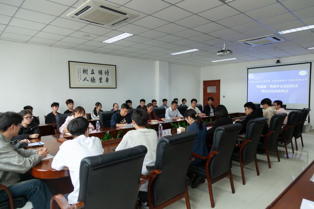 为进一步深化校企合作,助力高层次人才培养,10月15日下午,自动化与电子工程学院与青岛特锐德电气股份有限公司于学院楼408会议室联合举办了“特锐德”奖助学金签约仪式暨访企拓岗座谈会。青岛特锐德电气股份有限公司人力资源中心总经理韩增雪、人力资源中心人力总经理助理张莹、学院党委书记李卉、学院常务副院长兼机器人学院常务副院长巩敦卫、学院党委副书记兼副院长刘名森出席会议,2025届毕业生辅导员老师张郁浩、赵赪赪,以及首届“特锐德”助学金获奖学生与2025届毕业生代表参加会议。会议由学院党委副书记兼副院长刘名森主持。