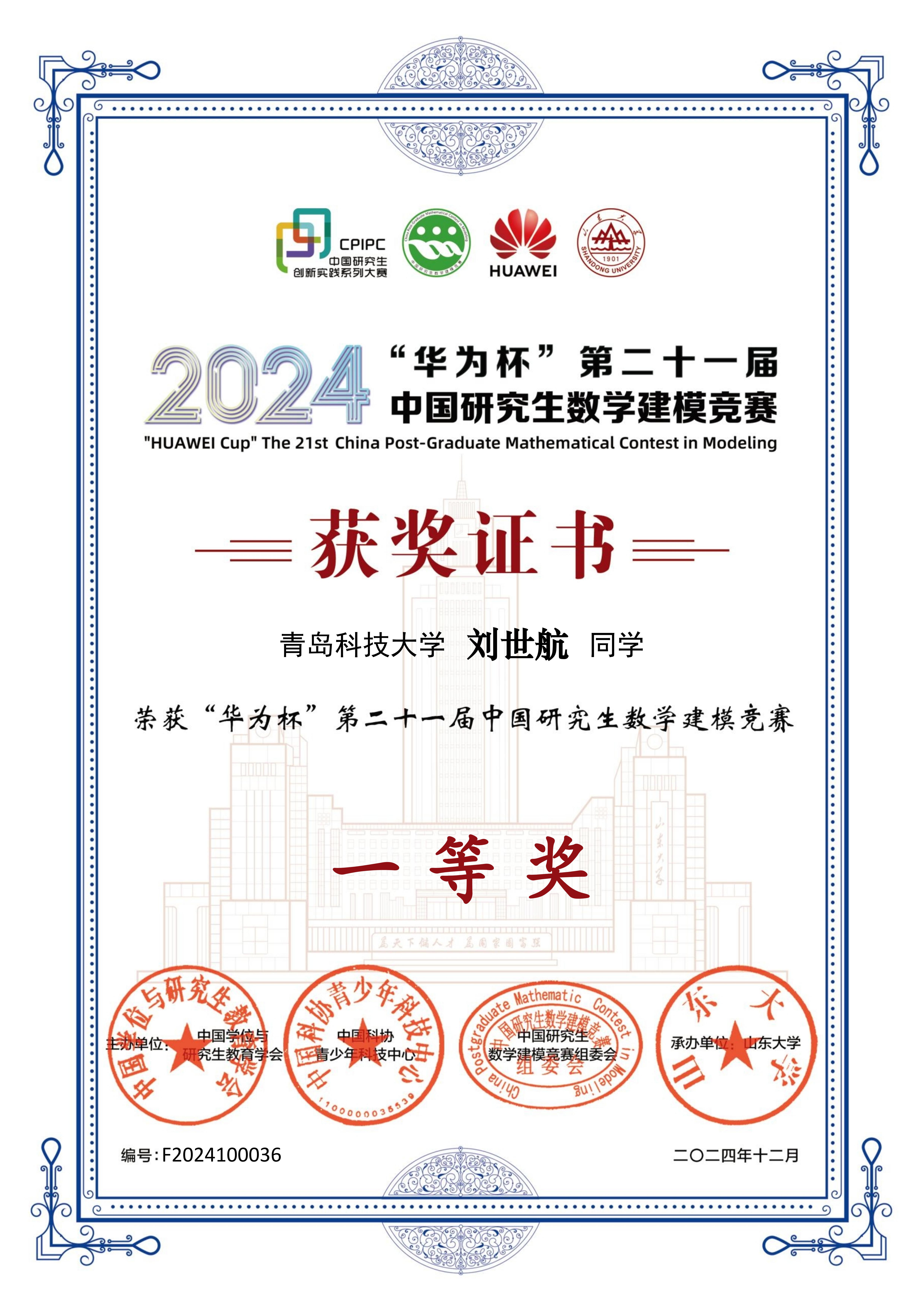 研究生刘世航(导师:邵巍)团队的作品脱颖而出,荣获中国研究生数学建模竞赛一等奖(全校唯一)。