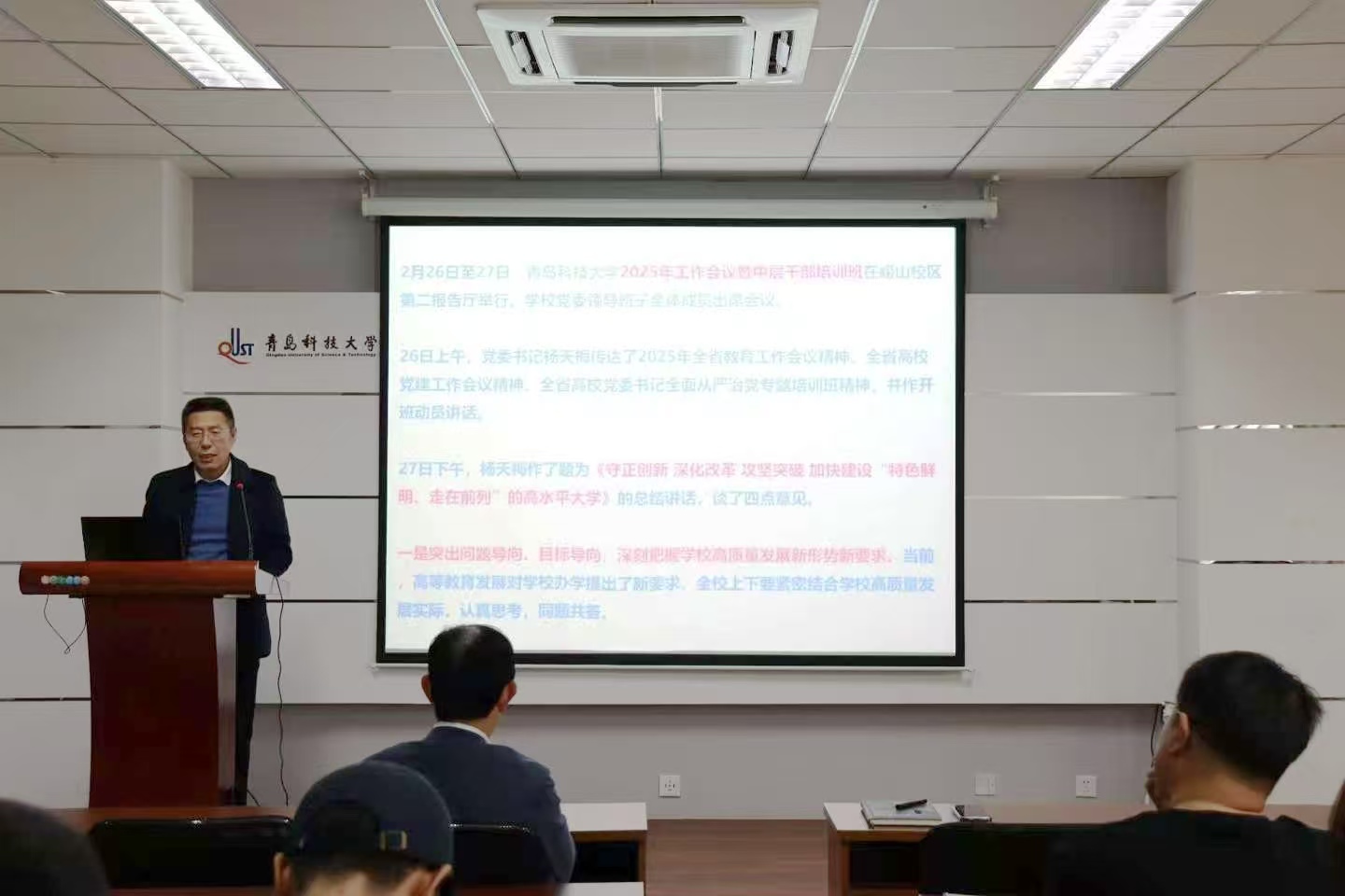 巩敦卫传达了学校党委书记杨天梅、校长陈克正在中层干部会上的讲话精神。杨天梅书记以《守正创新深化改革攻坚突破加快建设“特色鲜明、走在前列”的高水平大学》为题,提出四点要求:一是坚持问题导向与目标导向,科学研判高质量发展新形势;二是深化制度改革,以观念更新引领改革突破;三是聚力“811”项目建设、国家级奖励申报、“十五五”规划编制等攻坚任务;四是强化学术与管理两支队伍建设,提升队伍攻坚克难能力。陈克正校长系统总结2024年工作,部署2025年党建、学科建设、人才引育等八项重点任务,强调要锚定“十四五”收官目标,以改革创新加快实现“五年塑成优势”战略部署,奋力建设高水平大学。