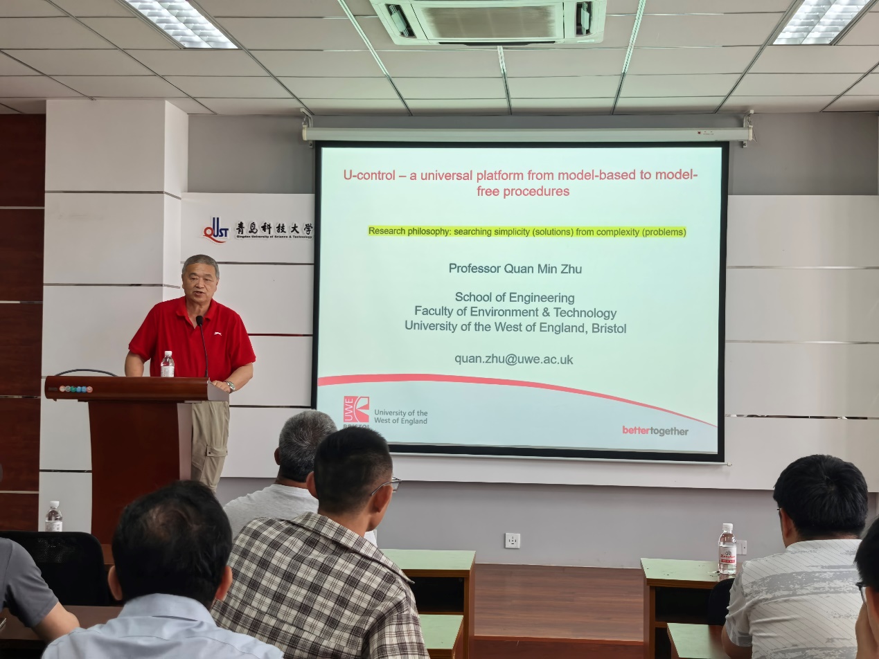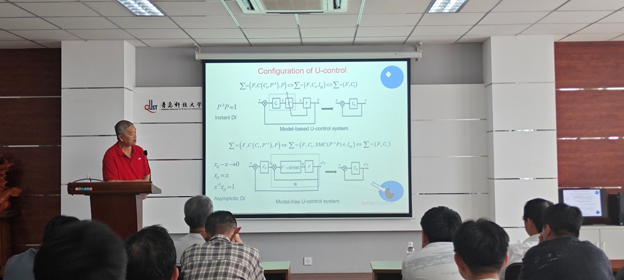 本次报告中,朱教授围绕动态逆控制、无模型滑模控制及线性不变控制器等U型控制中的关键问题进行了深入讲解,并将相关研究基础拓展至其他具有欠驱动模式和强非线性输入特性的系统类型。报告简要阐述了这些控制方法的核心思想、系统架构、算法原理及相关案例研究,引起了参会师生的极大兴趣,并就无模型控制问题展开了热烈讨论。