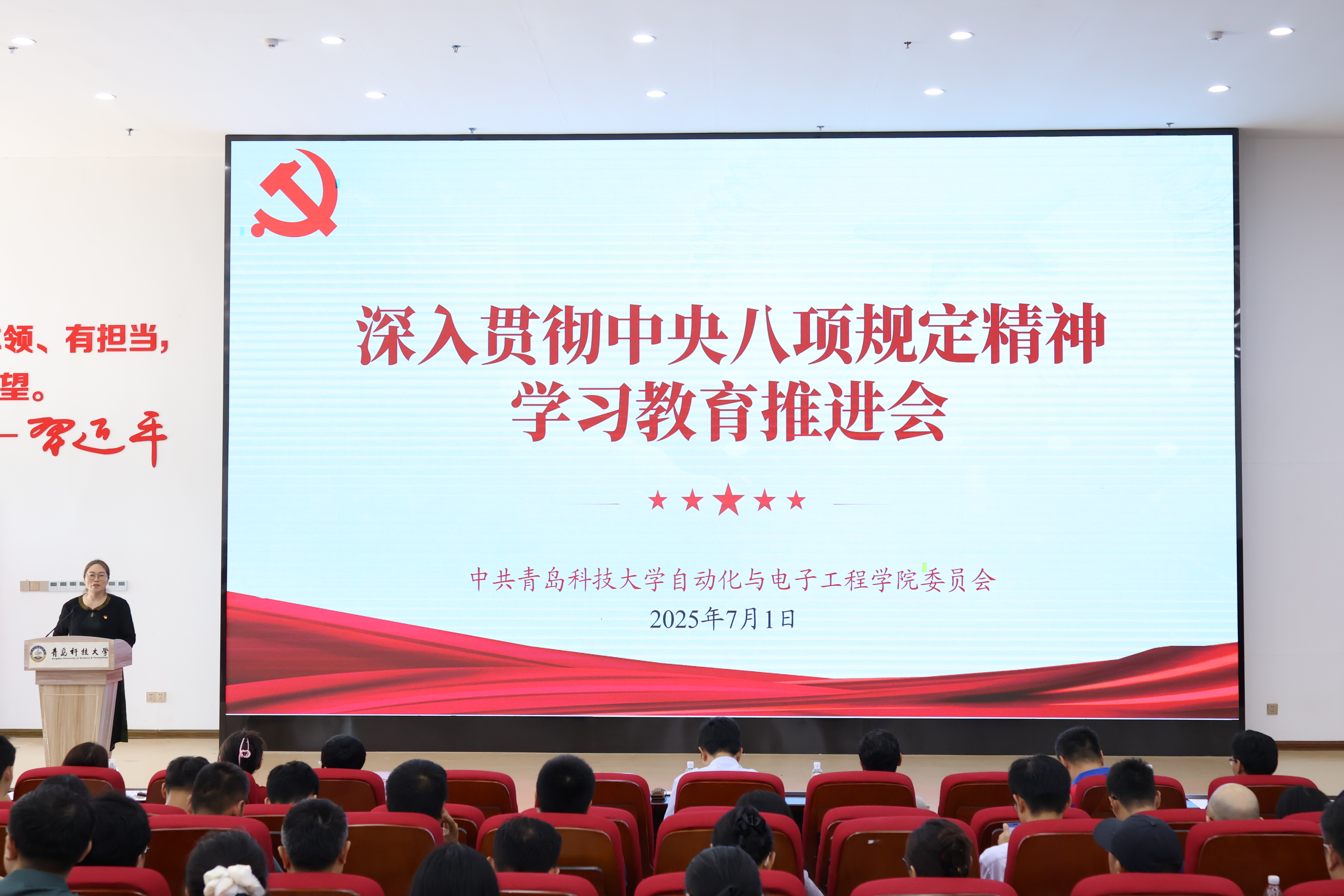 在团学报告厅召开深入贯彻中央八项规定精神学习教育推进会暨党员先锋表彰大会。学校党委正处级组织员王磊,学院党委书记李卉,学院党委委员、副院长张伟、生宁、张典及学院全体党员参加会议。会议由学院团委书记兼学工办主任雷静主持。