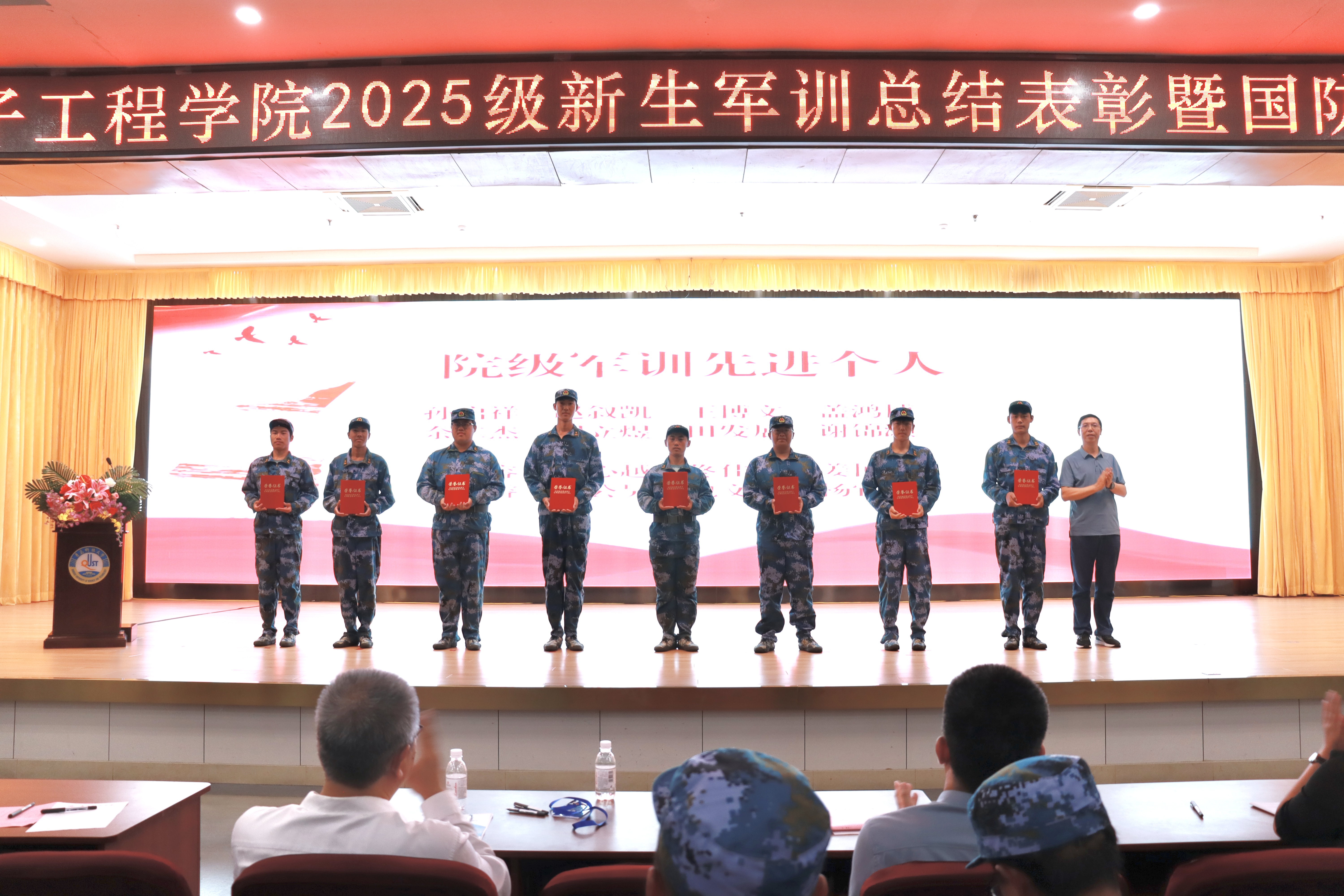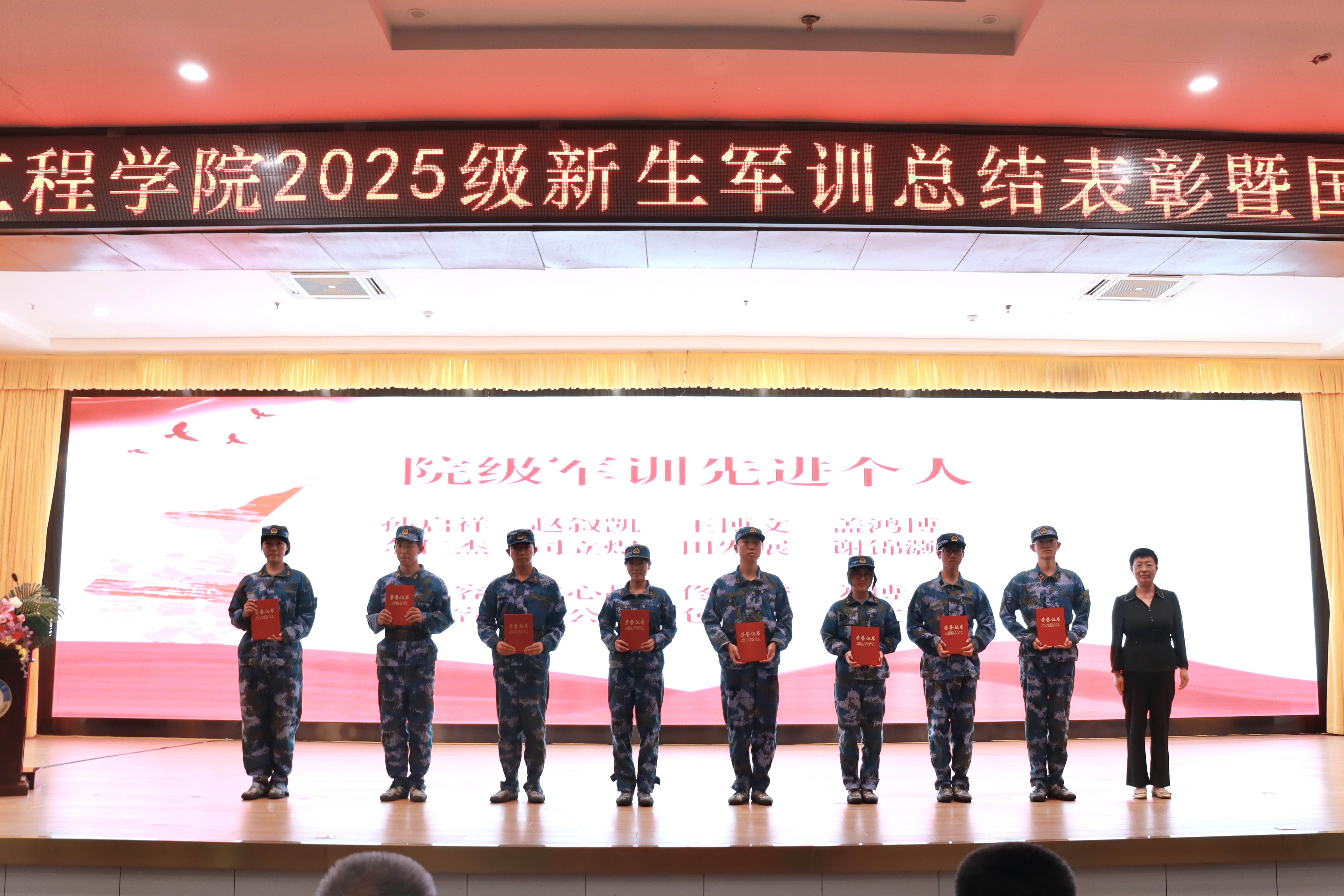 此次军训总结表彰大会暨国防教育主题活动的成功举办,不仅是对2025 级新生军训成果的全面总结,更是一次深刻的爱国主义教育和思想动员。相信 2025 级新生将以此次大会为新的起点,带着军训中的收获与感悟,在未来的大学生活中勇毅前行,成长为有理想、有本领、有担当的新时代青年。