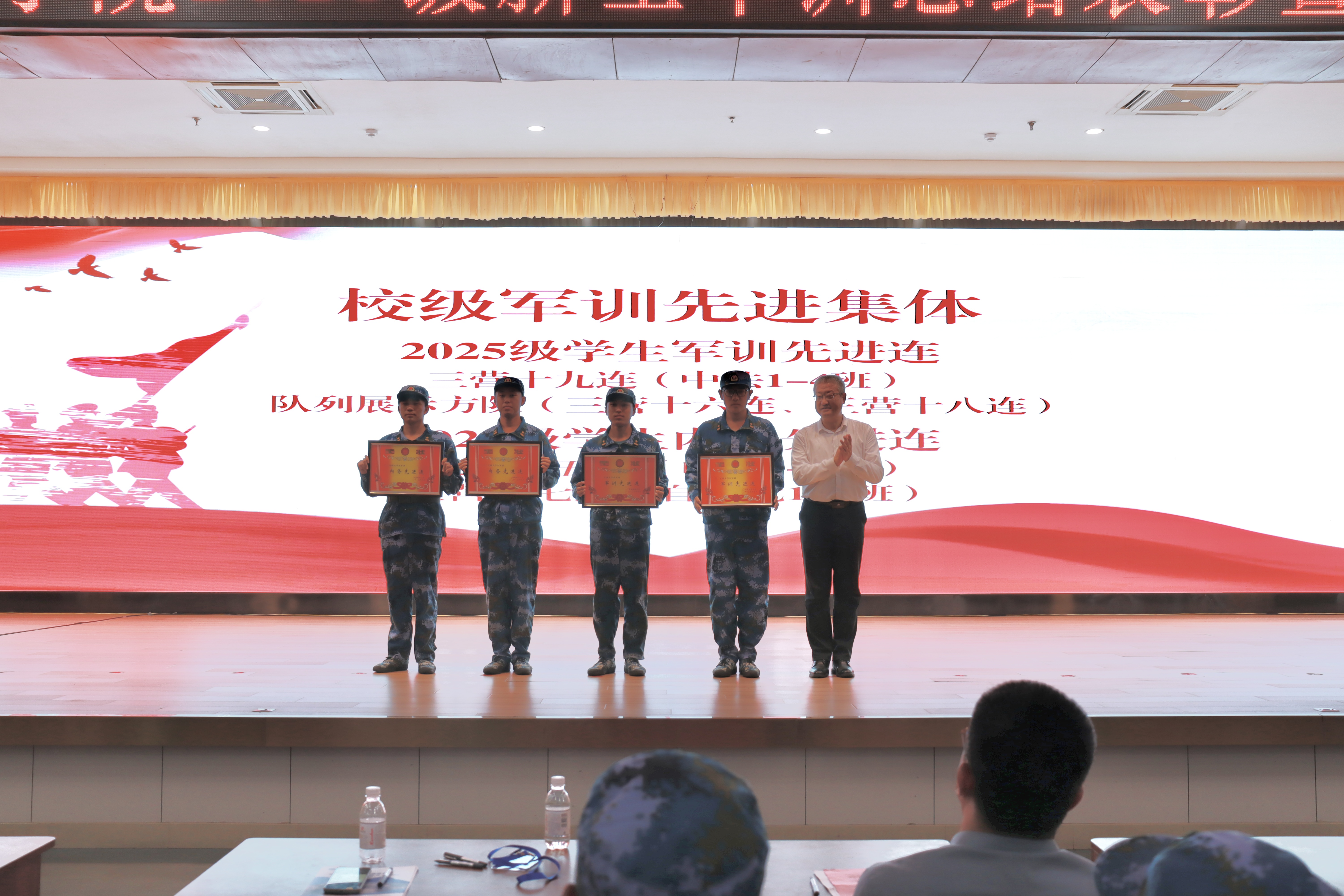 “2025级学生军训先进连”“2025级学生内务先进连”的集体进行颁奖,肯定新生们在军训中的卓越表现和顽强意志。刘名森为大象传媒