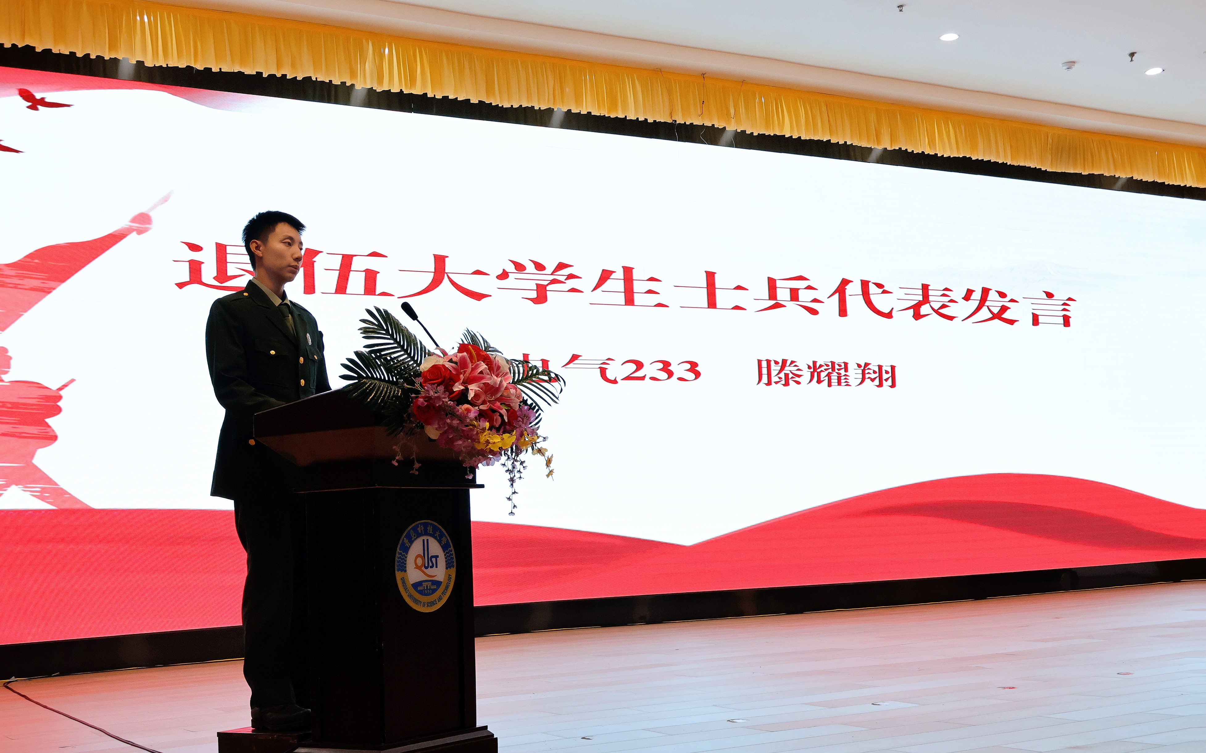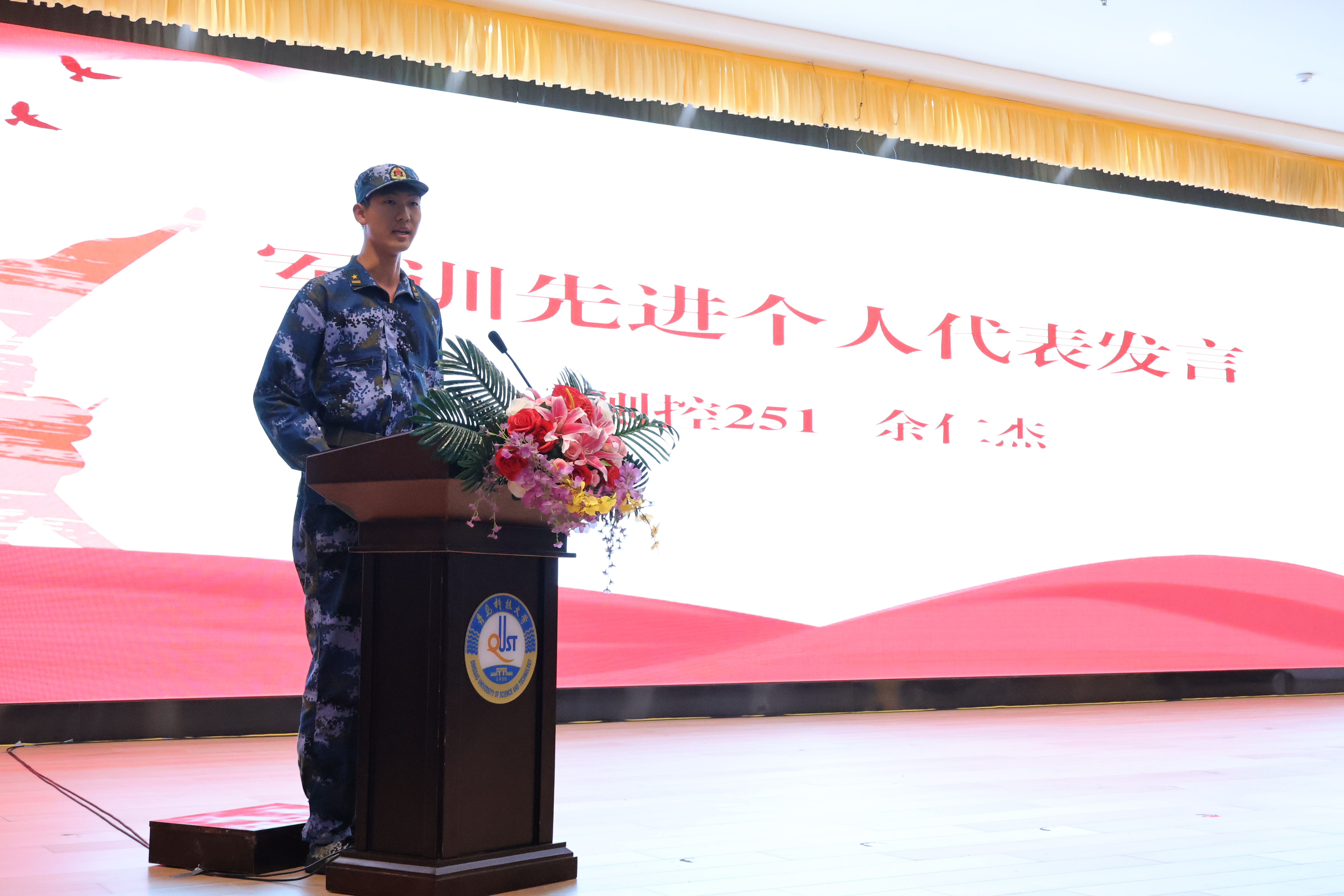 测控251余仁杰作为军训先进个人代表发言,分享军训收获与成长感悟,他表示,军训磨砺了新生们顽强拼搏、自强不息的品格,青年人要在吃苦中成长。电气233滕耀翔作为退伍大学生士兵代表,结合自身经历讲述军旅故事、戍边经历,传递国防担当。他表示,青年应当自觉增强忧患意识,加强思政学习,为建设社会主义现代化强国挺膺担当。