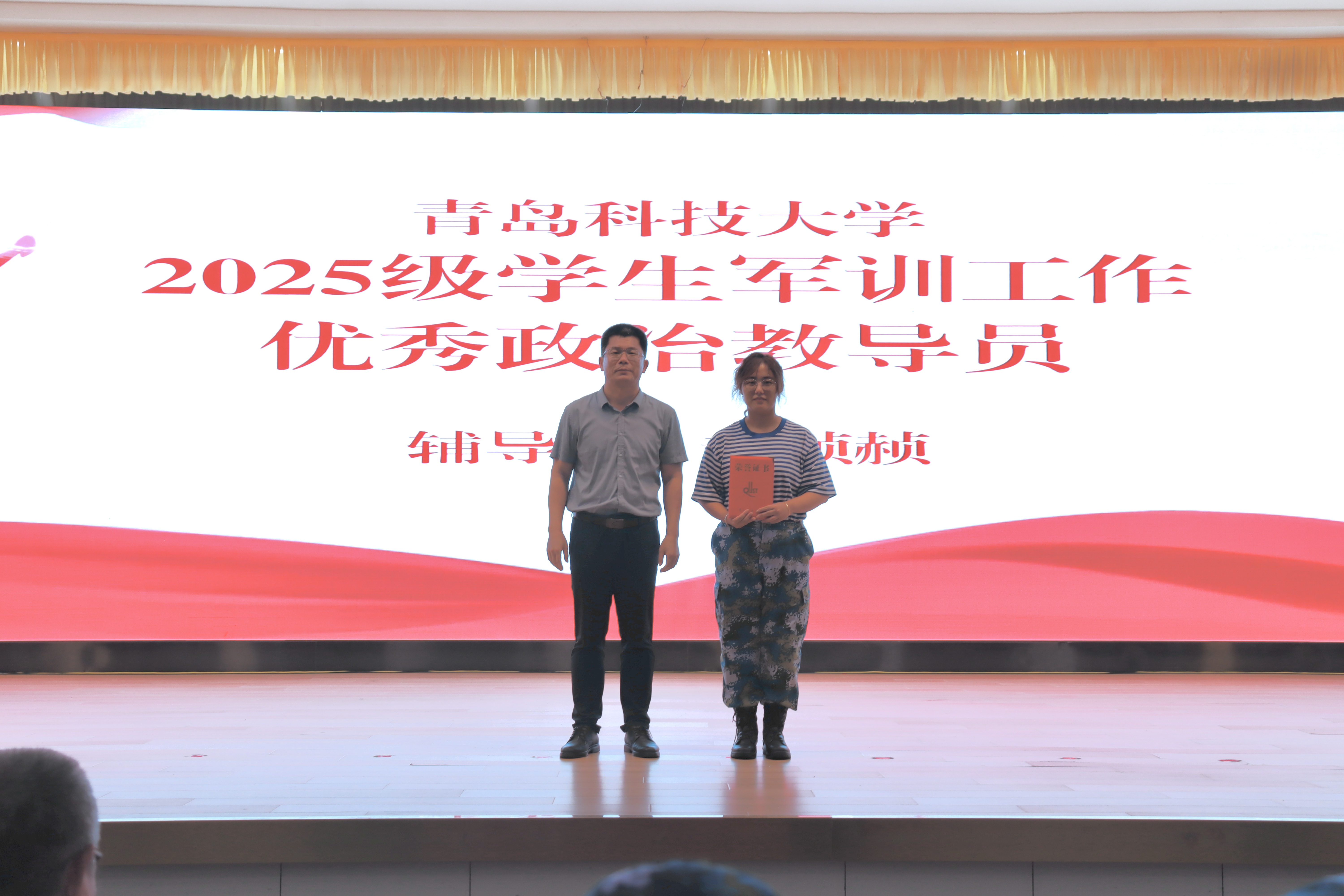 “2025级学生军训工作优秀政治教导员”获奖者赵赪赪颁奖,表彰其在军训工作中的突出贡献;张伟与生宁共同为学院“军训先进个人”颁发荣誉,激励新生以先进为榜样,争优创先、笃行不怠。