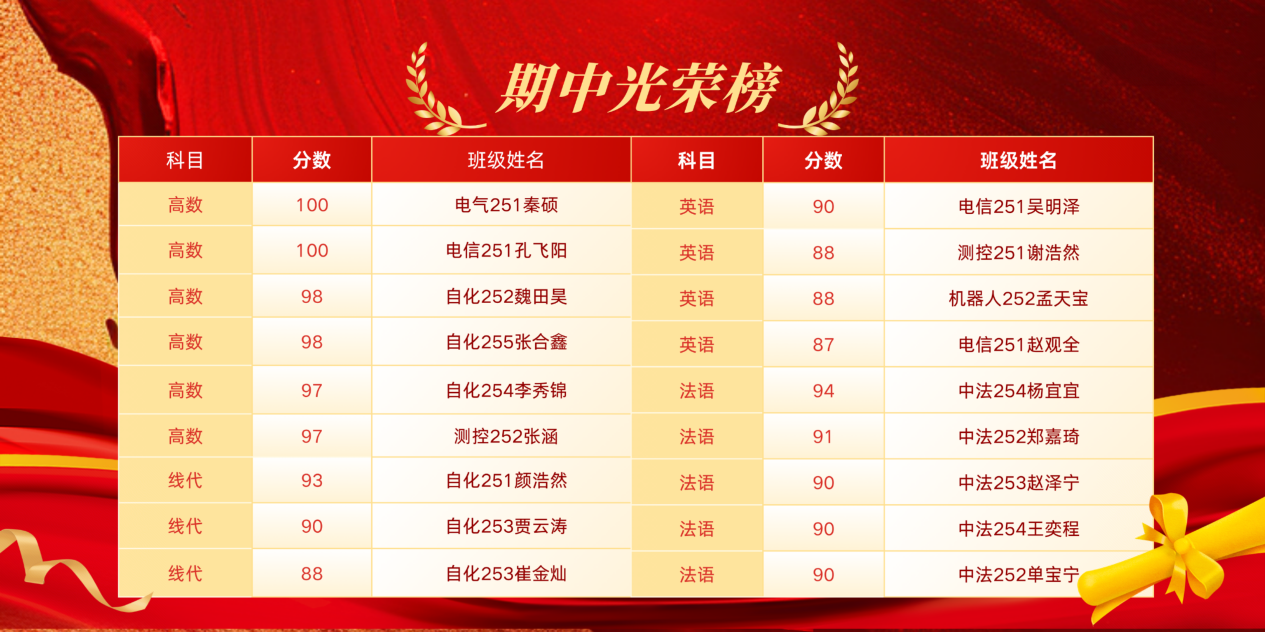 同时,为树立学习榜样,营造比学赶超的氛围,学院依据考试成绩,评选出高等数学、线性代数、外语三门学科的前三名学生,并制作成“期中光荣榜”进行公示表彰。