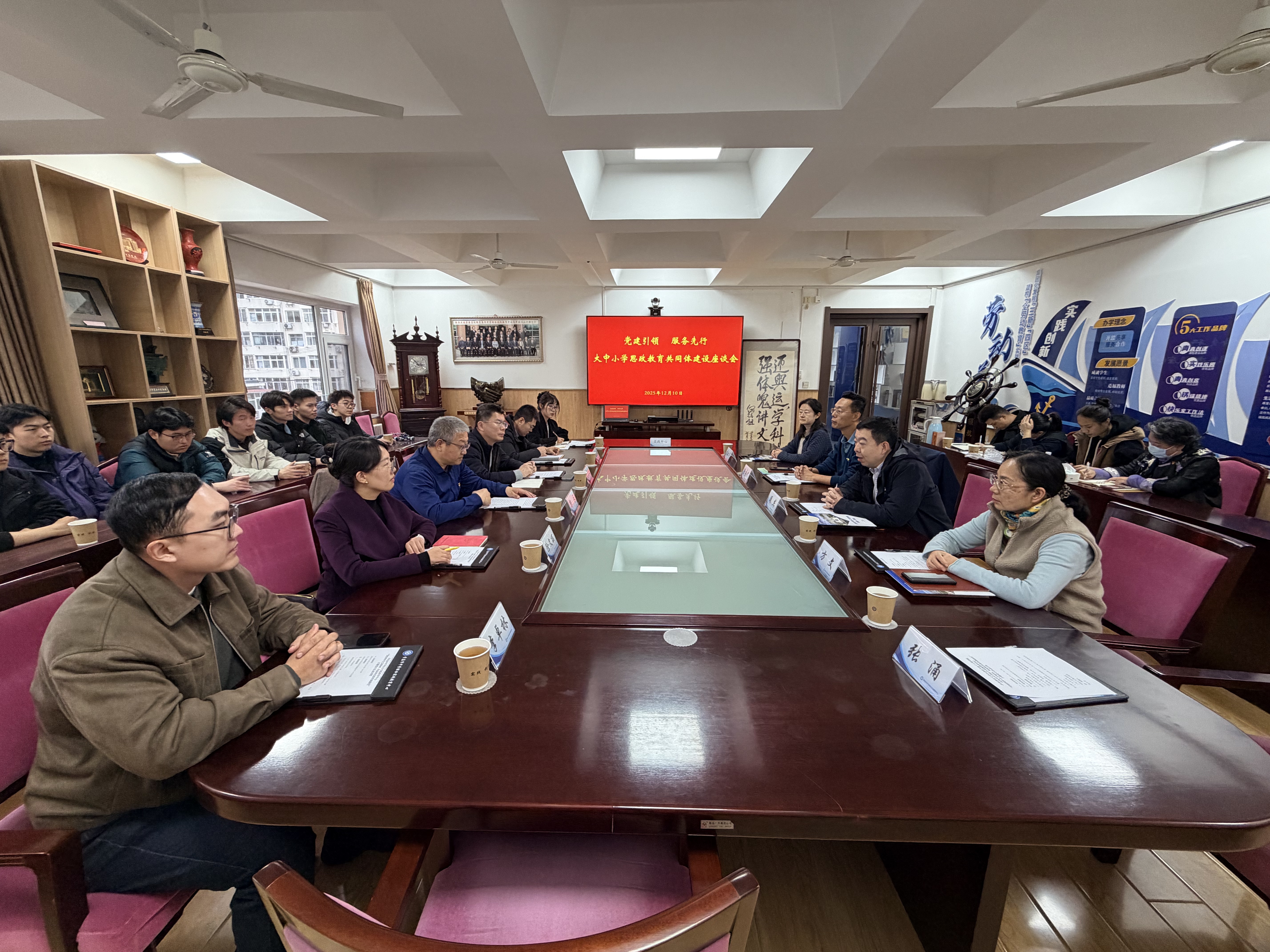 座谈会上,郭永系统介绍了学校及学院发展概况与办学特色。他强调,学院党委积极响应大中小学思政教育一体化建设号召,着力推动思政教育与专业实践向基础教育延伸拓展。此前,学院已与中心签署党建共建协议及技术服务合同,在科技赛事服务、志愿支持等领域取得显著成效。他提出,学院将以更高政治站位、更实工作举措深化合作:一是精准对接高校科研平台、师资力量与中小学实践需求,开发科技与思政深度融合的优质课程;二是建立常态化交流机制,在党建经验互鉴、教学成果共享、师生结对共建等方面持续发力;三是联合申报思政教育与科技教育融合项目,探索可复制推广的青岛特色一体化育人模式。周杰介绍了中心的建设发展、核心职能及办学成效,重点阐述以劳动教育和科技教育为双引擎的育人理念,表达了深化共建合作、共促青少年科技素养提升的坚定意愿。徐永俊介绍了中心党建工作及特色品牌“铁锚精神”:该铁锚曾随海军某重要舰艇服役,参与一系列试验试航和重大演习任务,多次接待军内外首长视察参观,于2003年9月光荣退役,2004年扎根实践中心。中心以此为核心凝练的“铁锚精神”,即敦实的思想作风、扎实的工作作风、朴实的生活作风。