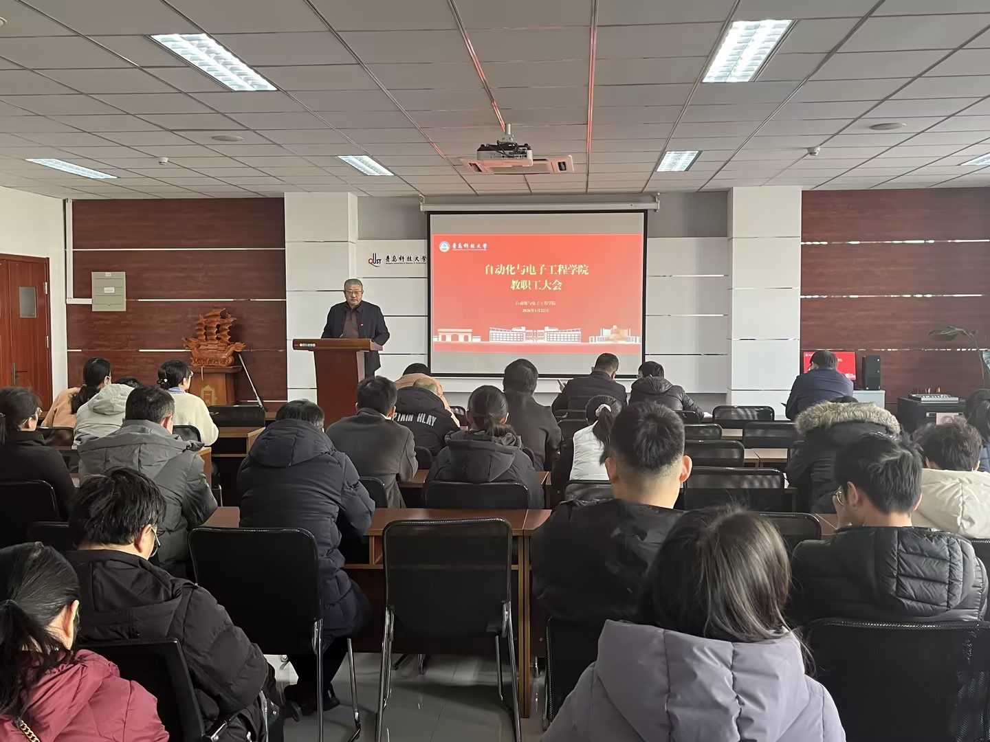 1月22日上午,自动化与电子工程学院在学院楼410会议室召开新学期全体教职工大会,部署假期及下学期重点工作,明确绩效分配、安全管理、就业工作和教学建设等核心任务,学院领导班子及全体教职工参加会议。会议由学院党委书记郭永主持。