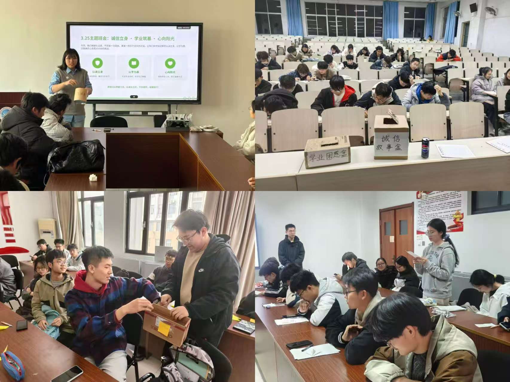 本次“诚信盲盒·心灵交换”主题活动,是学院“智行筑心”心理工作站落实3·25心理健康节“学风诚信·心理护航”核心任务的特色实践,以创新灵动的形式打破了朋辈沟通壁垒,既有效引导学生直面学业难题、释放心理压力,也推动诚信治学理念在班级层面落地生根、入脑入心。活动不仅创新了学风建设的实践载体,更将心理育人与学风建设深度融合,为学院营造风清气正、同心共进、阳光向上的优良学风筑牢了坚实的心理根基与诚信底色。