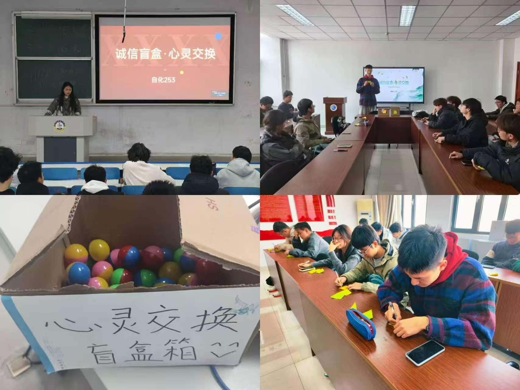 本次活动前期筹备周密规范,各班级紧扣活动主题,精心制作诚信故事盲盒、学业困惑盲盒,配套准备分类色彩卡片等物料,为活动有序开展筑牢基础。各班心理委员紧扣“学风诚信·心理护航”的3·25活动核心,系统解读学术诚信的核心内涵与优良学风建设的实践要求,明确匿名、真诚、尊重、保密、正向的五大活动原则,为同学们营造安全、包容的交流氛围,保障大家敞开心扉、放心表达。活动现场,同学们以匿名形式,将自身学业发展中的困惑迷茫、诚信治学的成长经历与感悟思考书写于卡片之上,分类投入对应盲盒。