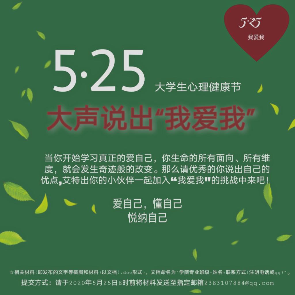 适逢我国抗疫斗争内防扩散外防输入的决胜阶段,大学生陆续复学,普及心理健康知识,帮助他们正确认识自我、关注自我心理健康、化解心理危机,激发学习内在动力,建立和谐人际关系,促进身心健康和全面发展,营造关注心理健康,提升我校心理健康教育水平尤为重要。为响应我校第十八届大学生心理健康节,自动化与电子工程学院心理工作站发起了“大声说出‘我爱我'”主题活动挑战,欢迎大家参加。