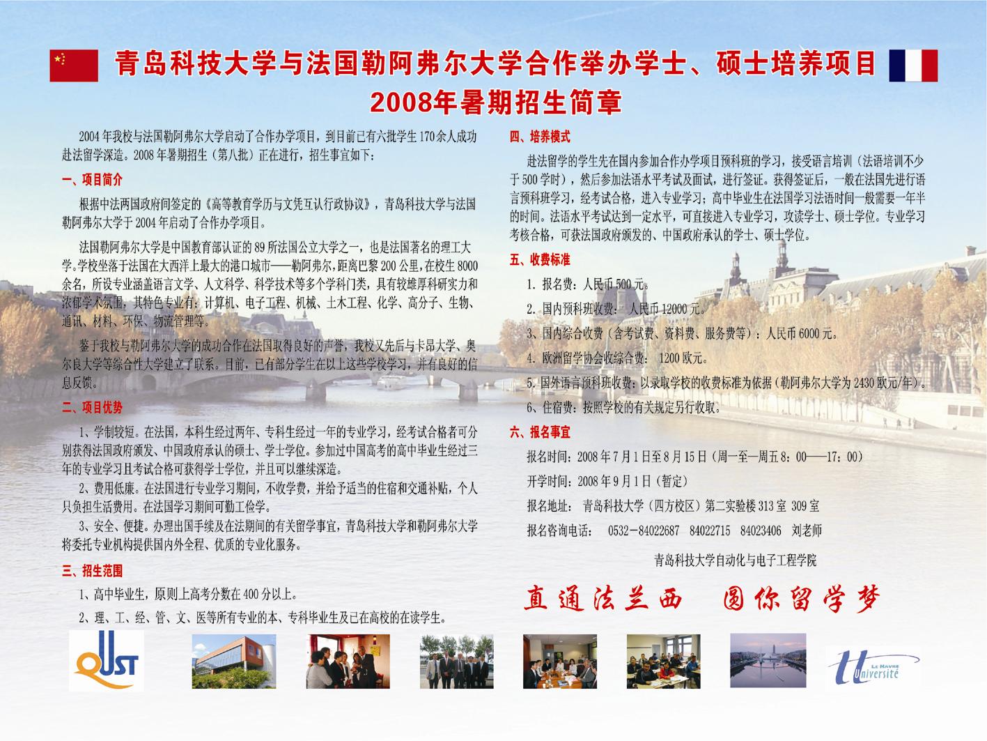 2004年我校与法国勒阿弗尔大学启动了合作办学项目,到目前已有六批学生170人成功赴法留学深造。2008年暑期招生(第八批)正在进行,招生事宜如下: