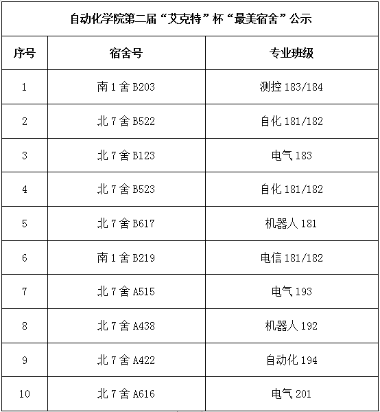 根据《关于开展第二届“艾克特”杯“最美宿舍”评选活动的通知》,经资格审核、年级评议、公开评审等环节,拟确定南1舍B203等10间宿舍为大象传媒 第二届“艾克特”杯“最美宿舍”。现予以公示,公示期为12月10日至12月12日,如有异议者,请在公示期内实名向学院反映。
