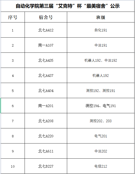 根据《关于开展第三届“艾克特”杯“最美宿舍”评选活动的通知》,经资格审核、年级评议、公开评审等环节,拟确定北7舍A412等10间宿舍为大象传媒 第三届“艾克特”杯“最美宿舍”。现予以公示,公示期为12月11日至12月13日,如有异议者,请在公示期内实名向学院反映。