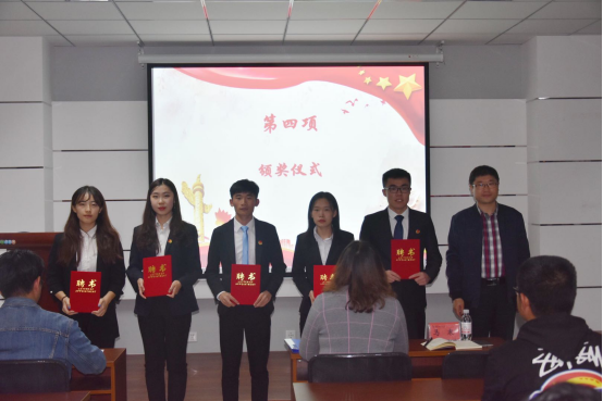 自动化与电子工程学院第十六届学生委员会主席团、部长团的决定》。由马寒为新一届主席团成员及部长颁发聘书,郭蒙蒙和王伟欣为新一届部长颁发聘书,于彬为优秀部长颁发荣誉证书,孙晓旭和吴擎为优秀干事颁发荣誉证书,并分别与学生们合影留念。