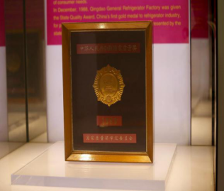 在1985年,海尔派遣领导和部分骨干前往德国学习最新的实际理念和生产技术,回国后将琴岛——利勃海尔牌、亚洲第一代四星级电冰箱投放市场,很快便以高技术,高质量赢得了广大消费者的信任。1987年,海尔被全国48家大型商场联合推举为最受消费者欢迎产品电冰箱类第一名,1988年荣获中国冰箱史上的第一枚国优金牌。此后,各项荣誉接踵而至:中国十大驰名商标、国家质量管理奖、全国畅销国产商品金桥奖第一名。海尔在家电行业第一家通过ISO9001国际认证和美国UL认证、德国VDE认证、加拿大CSA认证等10余项认证,被公认为中国家电第一名牌。如下图海尔成立初期获得的奖项之一。