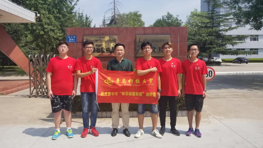 赴齐鲁石化“新旧动能转换”调研团在指导老师刘海波的带领下到达齐鲁石化研究院,在齐鲁石化研究院门前刘海波为调研团队员举行佩戴团徽仪式。