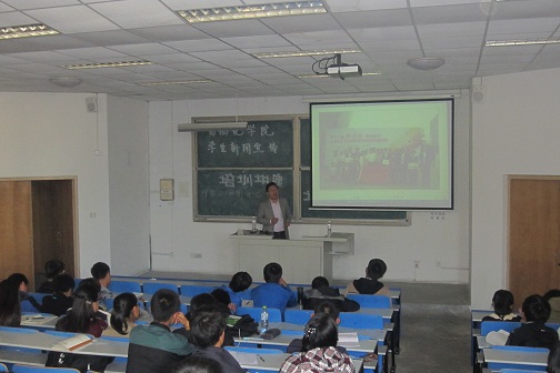 分团委副书记兼学工办主任刘兆鹏老师在崂山校区进行了以新闻宣传为主题的培训讲座。参加此次讲座的有大象传媒