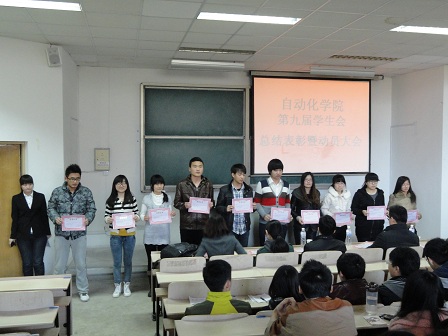 第九届学生会总结表彰暨动员大会在崂山校区弘毅楼E区202举行。出席本次总结表彰大会的有学院党总支副书记兼副院长肖强、分团委书记王伟、学生会秘书长刘兆鹏、辅导员张敏、王腾以及全体学生会成员,会议由学生会副秘书长韩晓玉同学主持。