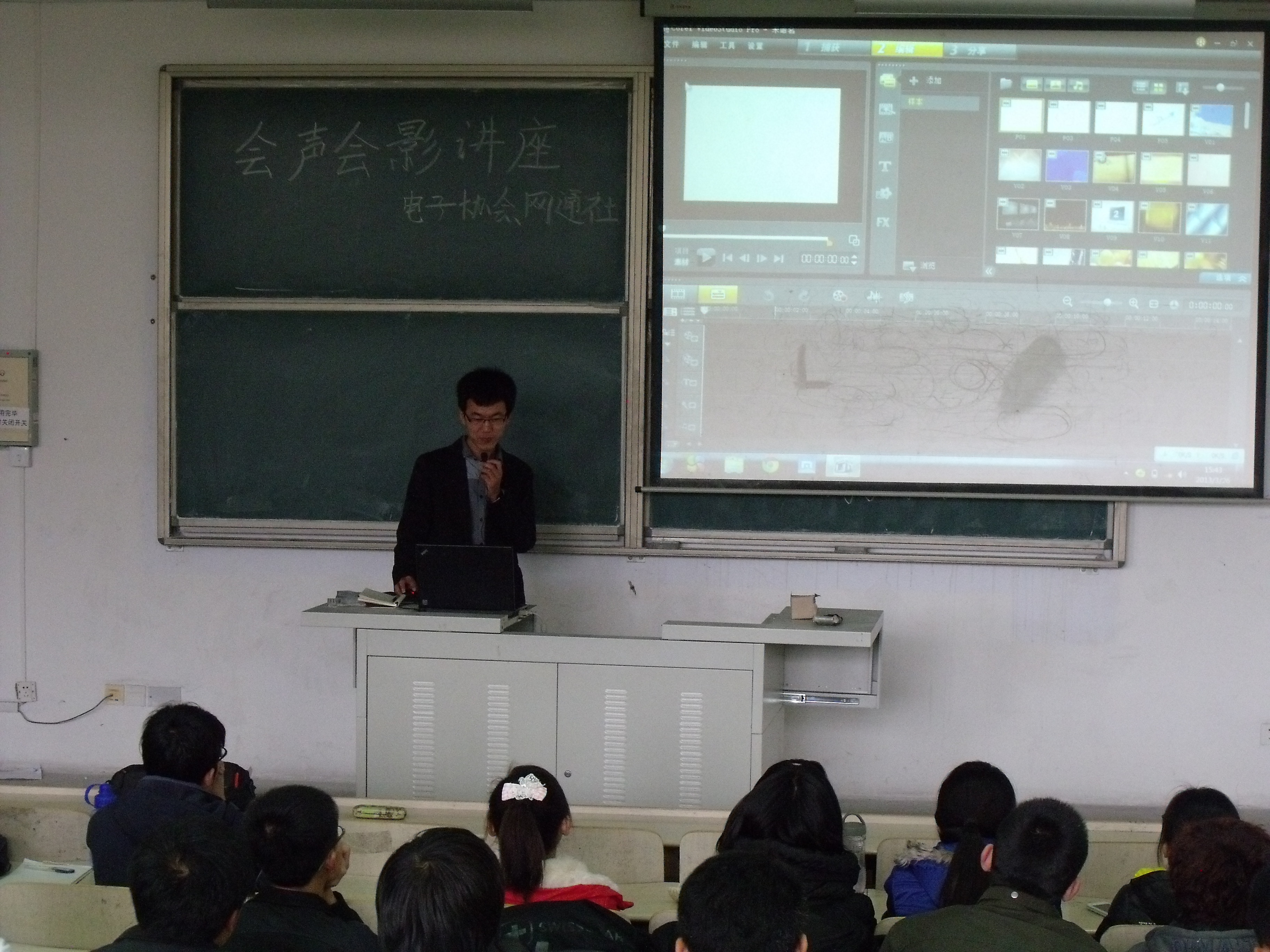 为了让同学们更好的了解电脑,利用电脑,3月26日,大象传媒 电子爱好者协会与网通社共同在在弘毅楼E区202教室开展了“会声会影”电脑知识讲座。