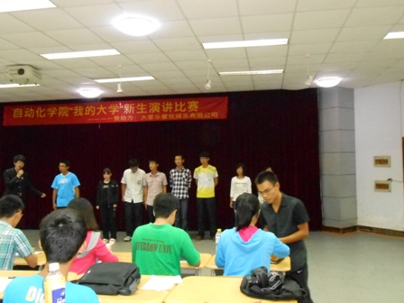 演讲与口才协会副会长许凯和孙铭阳。比赛共16名选手,每位选手首先慷慨激昂的阐述自己的想法,对大学生活的憧憬,然后由评委对选手的演讲进行点评,打分。最后,自动化4班的薛钧瀚以9.125高分荣获一等奖,二等奖由刘晓鹏,秦娜获得;三等奖赵艳萍,朱道伟,张世林。另外韩晓彤获得最佳表现奖,李文瀚获得最佳台风奖。