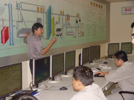 队员们一进控制室,便看到一排严阵以待、高速运行着的计算机列兵似的排列在控制室中央,工作人员都认真专注地盯着显示屏,随时准备应对突发情况。大家默默地参观着控制室,尽量不打扰这里的工作,简单不带一丝赘物的控制室毫不起眼,却是具有国际领先水平的MES系统。据介绍,该系统由海化纯碱厂和浙江大学合作开发,能在过程控制中根据一项参数的要求自动调节各相关指标,实现了远远胜过人工的智能模糊控制。据介绍,近年来海化以高新技术成果和信息化手段,嫁接提升传统产业,再造业务流程,降低了各项消耗,提高了劳动生产率。越是不起眼,越是潜藏着傲人的实力。在海化,大家就深刻地认识了这一点。