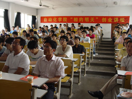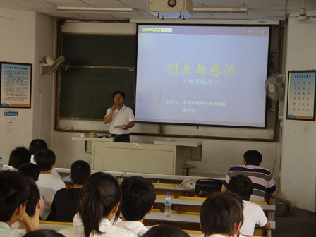 下午一点,报告会正式开始。首先,院长王培山对隋总裁做了简单的介绍。院长对隋总裁在商界、政界及学界的身份和影响力做了详细的说明,并高度评价了总裁在创业二十年中所取得的成就。之后,在热烈的掌声中,隋总裁走上讲台,开始他的精彩讲述。演讲分为“创业历程“和”“感悟人生”两个篇章,隋总裁先对自己人生的大致轨迹做了简单地概括——他是铸造专业出身,三十八岁辞职创业,已经走过二十年风风雨雨的创业历程。然后,隋总裁对自己创业的三个阶段进行了详细讲述。创业分为创业孕育和起步阶段、创业成长阶段和创业发展阶段三个阶段。创业起步阶段,他在社会的大纲中选择了自己所熟悉的产业USP,靠请进嫁接产品,让自己的企业在市场中站住脚;创业成长阶段,他让自己的企业蹲着成长,不和大企业正面竞争,从没有自我中缓慢的拥有自我;创业发展阶段,他作为一个老板,逐渐学会做人,学会带人,学会整合,学会观天,不断地调整企业的坐标,让自己的企业做大做强。接着,隋总裁与大家分享了自己的人生感悟。隋总裁提出“要先立家后立业,创业需要时间,需要“你我他”,他警告大学生刚毕业不要急着创业,要先在社会中磨练一番。他又用时间为横坐标,成长为纵坐标,在黑板上用阶梯状的图形象地比喻了人生成长的阶段,他讲到,“人在成长中需要有贵人的相助才断不断地攀登人生的台阶”。最后,副院长肖强对报告会做了简单的总结,他高度评价了隋总裁的演讲,指出他的演讲对我们今后的成人成才必将有深远意义。