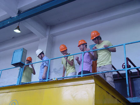 在参观实践的过程中,郭经理详细的介绍了发电的唯一燃料——煤泥。原煤从主井提升上来,进入洗煤厂,选出来成块状的,叫做精煤,也有的叫做块煤;还有其中成颗粒状的煤渣、小煤块,就叫做中煤;那最后沉到水底的煤灰、煤屑就被称为煤泥。它含有的主要是细分煤、少量的水和稳定量的纤维素醚化合物,好煤洗剩下的也都是优质煤泥。良达煤矿秉承科学发展观中可持续发展的指导思想,将煤矿生产中产生的废弃物煤泥进行加工将其制成一种悬浊液的形态,这样即能是煤更加充分的燃烧,增加热值,又便于向锅炉中增加燃料,一石二鸟。从矿上运来的煤泥,首先存放在煤泥仓库,然后用铲车将其放到传送带上,运入加工车间,在搅拌机的搅拌下加工成悬浊液,用泵直接泵入锅炉顶部,这是整个煤泥在电厂中的传输和利用过程。