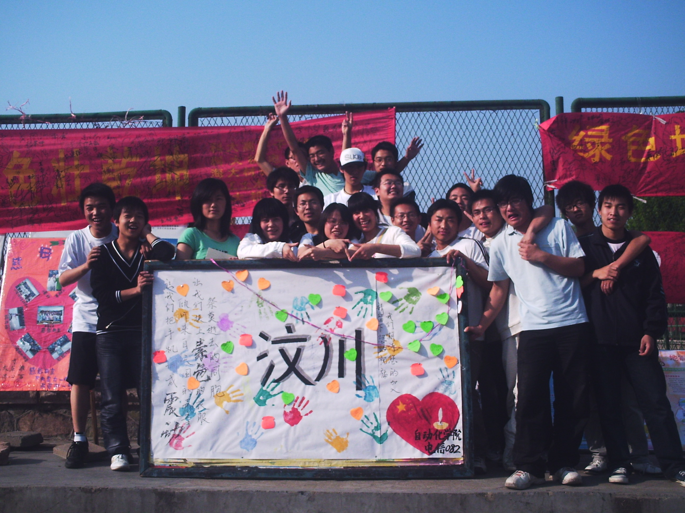 2009.5.12,正值汶川地震一周年纪念日,为落实科学发展观,电信082版于小五四北发起展板纪念5.12活动,郑重向全体师生发出倡议“让我们把手机调成震动,倾听来自天国的声音;让我们换上素色的衣服,祭奠逝去的同胞”:爱在无声处,感动中国心。