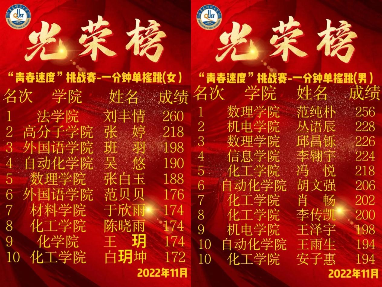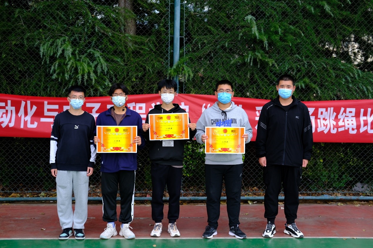经过选拔赛的海选之后,测控221班吴劲峰、电气223班王浩、机器人221班王雨生分别获得男子组单摇前三名;电网221陈宝怡、测控222吴悠、自化223刘佳睿分别获得女子组单摇前三名