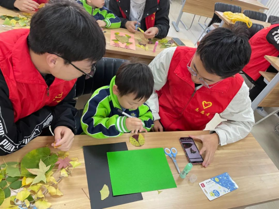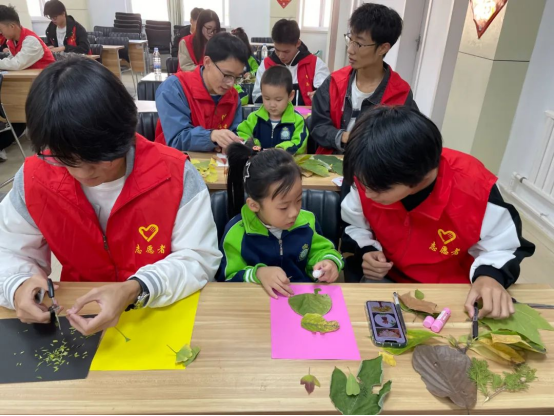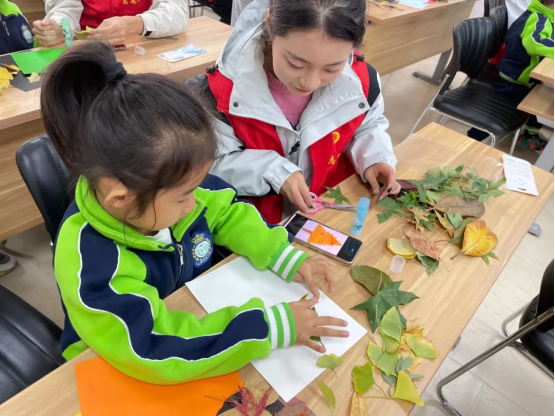 活动过程中,志愿者和孩子们将树叶裁剪成自己喜欢的各种小形状,拼贴出造型各异的图案。大大小小颜色各异的树叶在孩子们的巧手下被粘贴成了漂亮的美人鱼、可爱的小猪佩奇、灵动的小鸟等各式各样的树叶贴画。那些平日里随处可见的树叶变得生机盎然、栩栩如生,一幅幅美丽的树叶画充分展现了孩子们丰富的想象力和创造力。