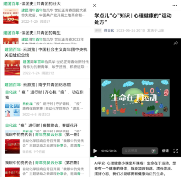 学院新媒体平台用户基础深厚,作品内容丰富,全年不断线。“微自化”累计总用户数5000+,累计发布推文1200余篇,年均阅读量突破20万。以2022年为例,推文阅读总量29.2万次,点赞在看破1.2万次,WCI指数位居全校前列。学院网站、官方抖音号、易班等新媒体平台与“微自化”联动互补,立足平台属性明确育人导向和主基调,春风化雨般夯实网络思政育人实效,推动网络思政育人向品牌化、专业化发展,拓展延伸思想政治教育阵地。