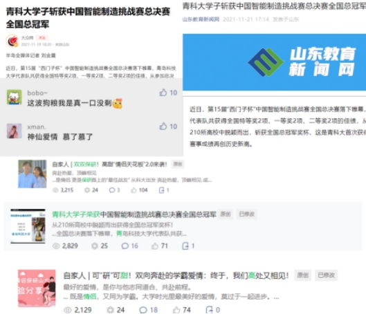 网络思政育人要扎根校园生活,立足青年发展,打造学生喜闻乐见、具有特色的品牌形象来进一步吸引学生参与其中,增加用户黏性。学院结合自身特色,从初代品牌形象“精彩自化,温馨家园”延伸塑造了有记忆点、有归属感的网络思政IP形象——“自家事”、“自家人”,独特且有记忆点的“旗舰”形象提升了网络思政育人温度,有效将“爱校荣校教育”、“感恩教育”与网络思政教育有机融合。近年来,由微自化推出的“自家事”系列新闻报道和“自家人”榜样学子典型受到校内外广泛关注,如“青科大学子首获中国智能制造挑战赛总决赛全国总冠军”、“高甜情侣天花板2.0”、“全‘研’上岸 保研宿舍”等阅读量单篇破2000+,累计万余次。“自家事”、“自家人”形象塑造融入学生生活,深入人心,激发学生自主参与思政学习的动力,弘扬学院文化,达到“不言之教胜于教”的效果。