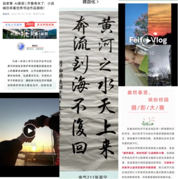 网络思政突破了传统思政育人过程中简单的思政教育主客体互动关系,把青年学生吸引到“思政教育团队”中来,在新媒体平台开展了线上书画作品展、“记录我眼中的青科大”作品征集、我的“自”在青春vlog大赛、“寻找校园最美瞬间”摄影大赛、校园公益摄影大赛等活动,激发更多以青年学子视角出发创作的思政教育“活教材”、“新资源”,在创作中提升学生思想和创新能力,推荐多批优秀作品参加校级比赛,多人获得校级一二三等奖项,学院多次获评优秀组织单位,辅导员赵赪赪获评优秀指导教师。