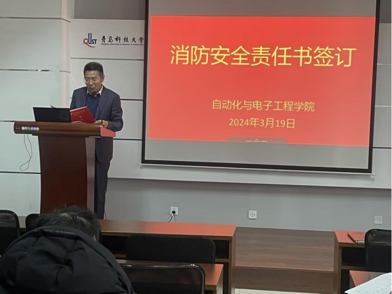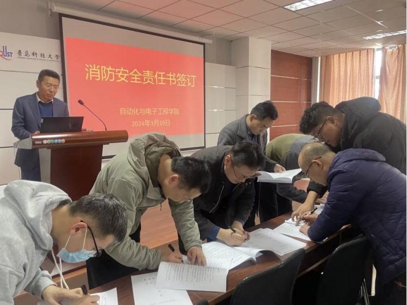 为了深入贯彻“安全第一、预防为主”的方针,有效防范化解校园消防安全突出风险,增强师生的消防安全责任意识,3月19日,自动化与电子工程学院在学院楼410会议室召开教职工大会,开展消防安全责任书签订活动。活动由常务副院长巩敦卫主持。
