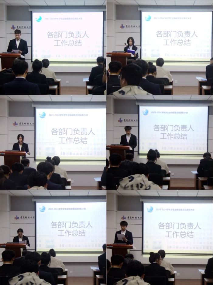 各部门负责人依次作述职报告,反思总结过去的工作,依据部门职能特点,汇报了各部门组织开展的各类工作、活动,端正工作态度,不断完善工作机制,提高工作效率,为同学们提供更加优质的服务,为学院的建设和发展作出更大的贡献。