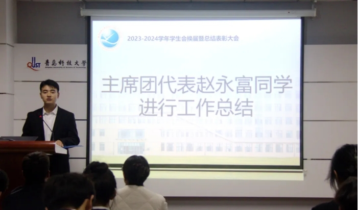 学生会执行主席赵永富聚焦立足新起点,适应新形势,践行新要求三个方面总结,做到学生工作“特色鲜明,活力十足”,为学院的未来发展贡献青春力量。他表示学生会将以“服务学生成长成才”为本年度重点工作,努力成为学生信任、学校放心、社会满意的先进组织。